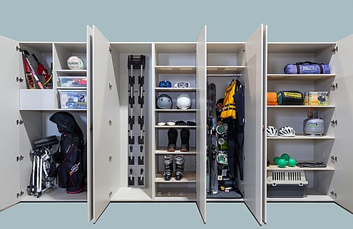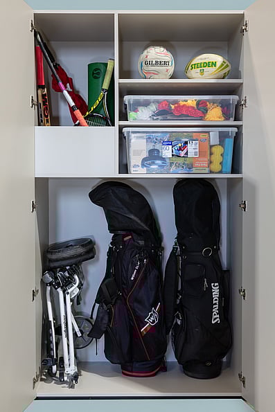 Sports CupboardDesigned for your golf equipment, yoga mats, tennis raquets, hockey sticks, cricket bats. This can be modified to fit a lawn mower or tent instead of golf clubs if that suits your needs.